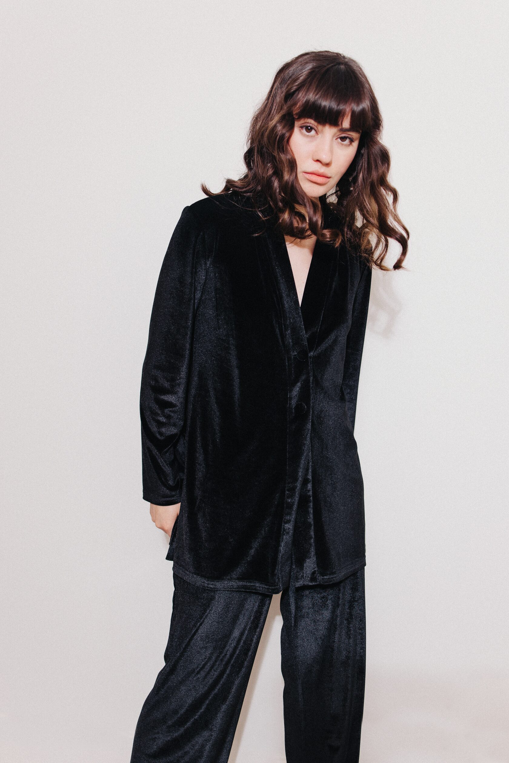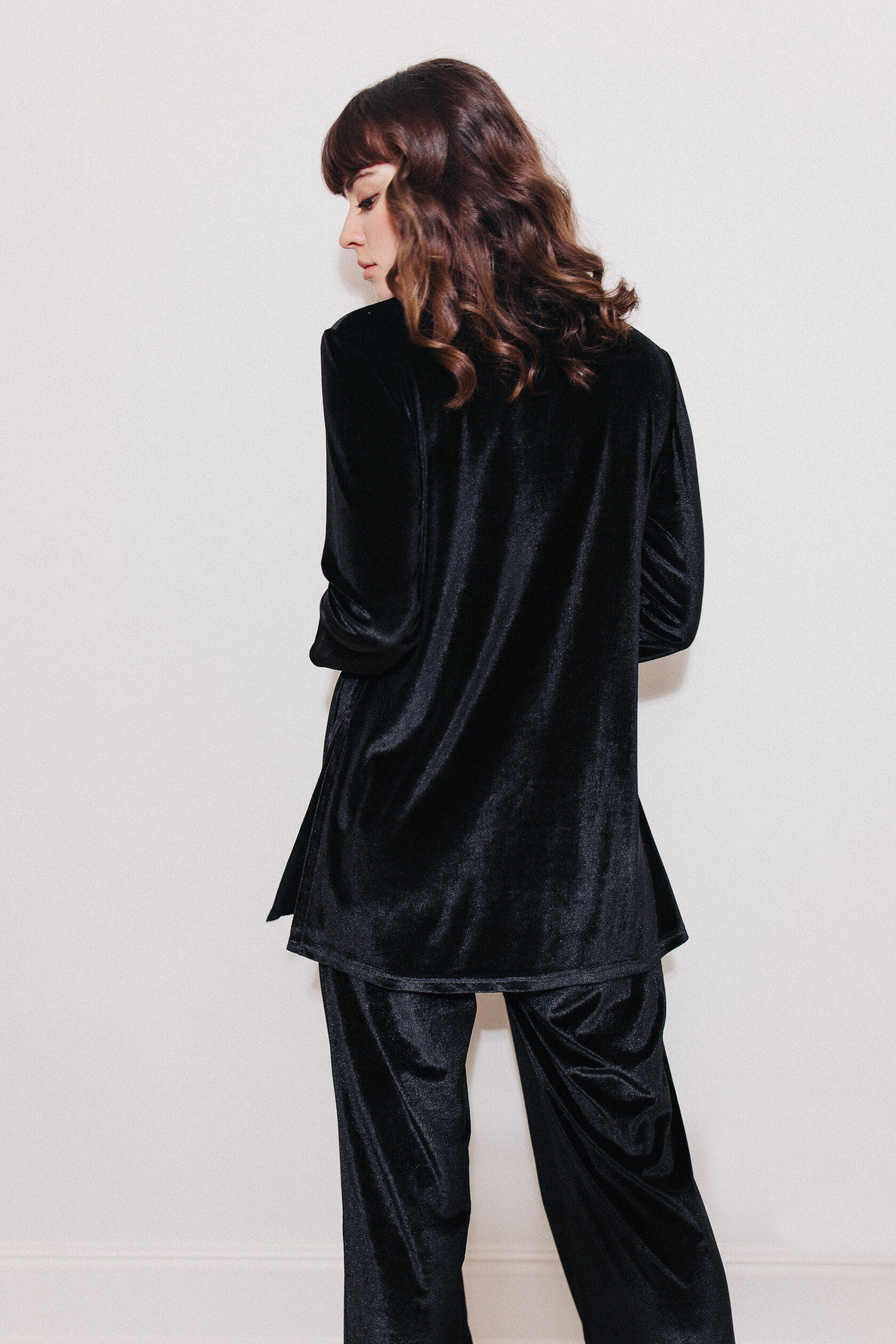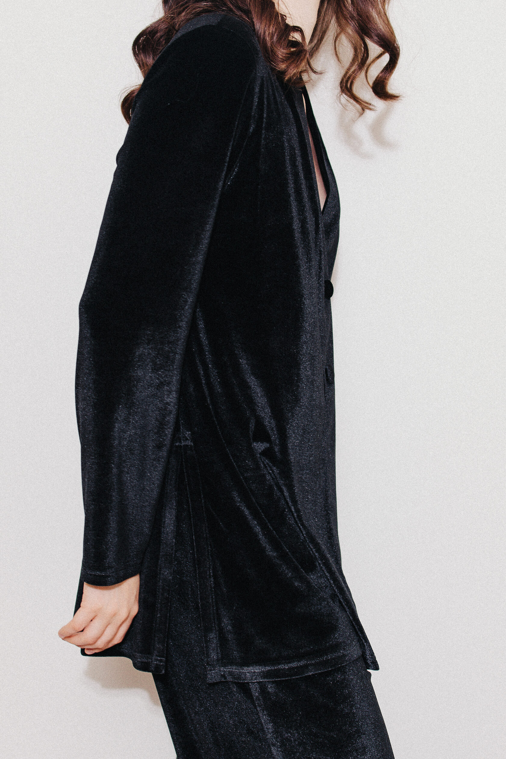 Костюм из черного бархата. Немного приталенный жакет на двух пуговицах имеет идеальную посадку в плечах и груди. Благодаря деликатным разрезам по бокам, он не только не сковывает движения, но и визуально удлиняет силуэт. Костюм дополняют брюки на мягкой резинке свободного кроя. Жакет и брюки можно носить как вместе, так и по отдельности. Идеален и универсален для дома. Вечеринка, детский домашний праздник или тихий вечер у камина - в нем вам всегда будет уютно и красиво.
