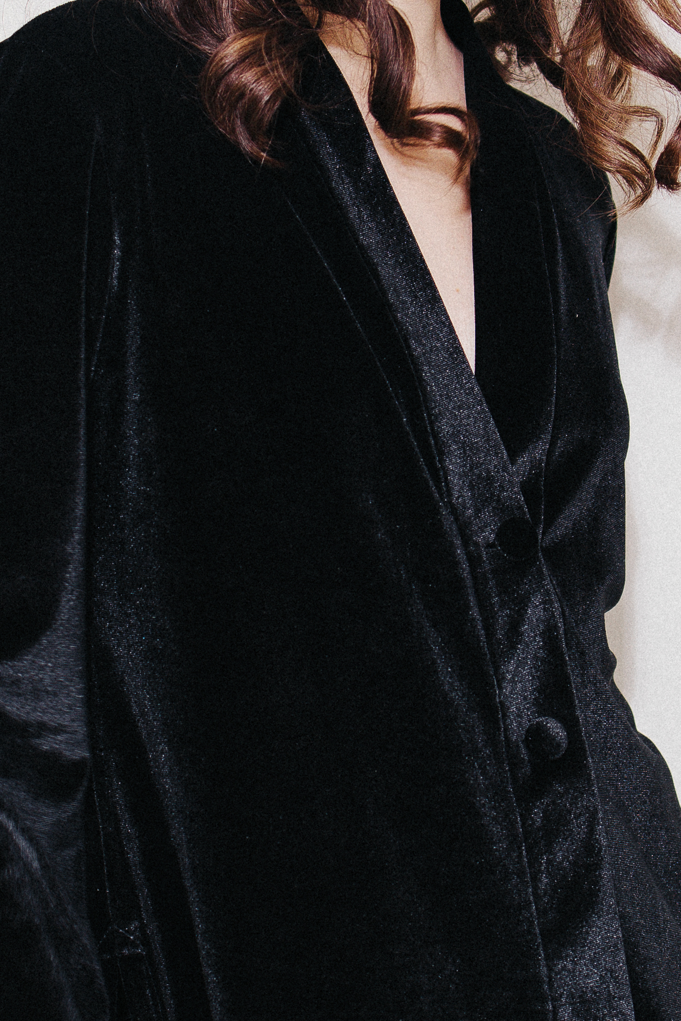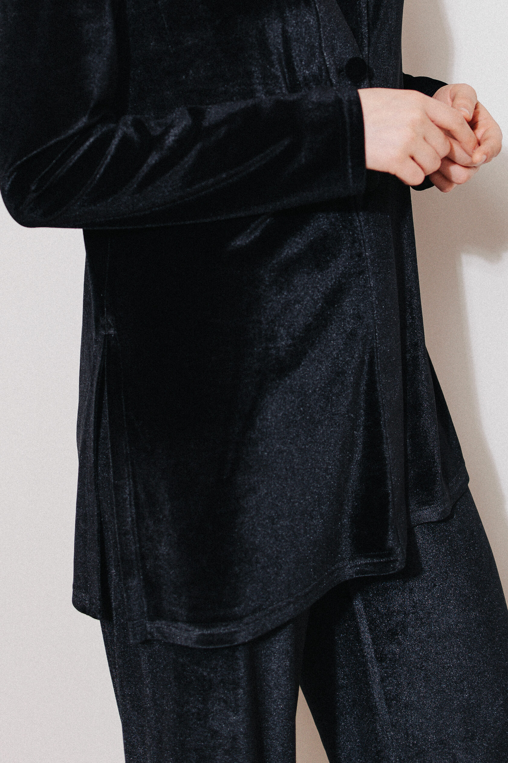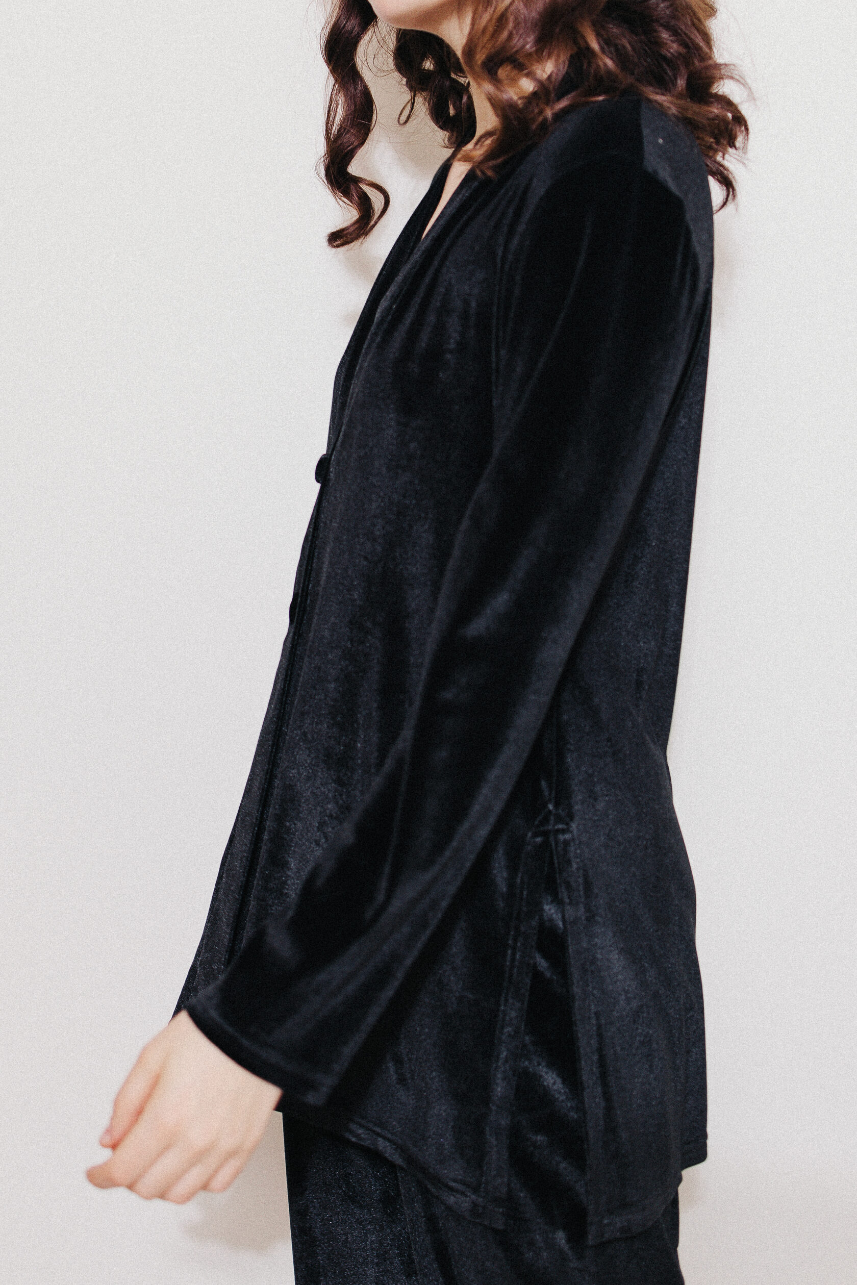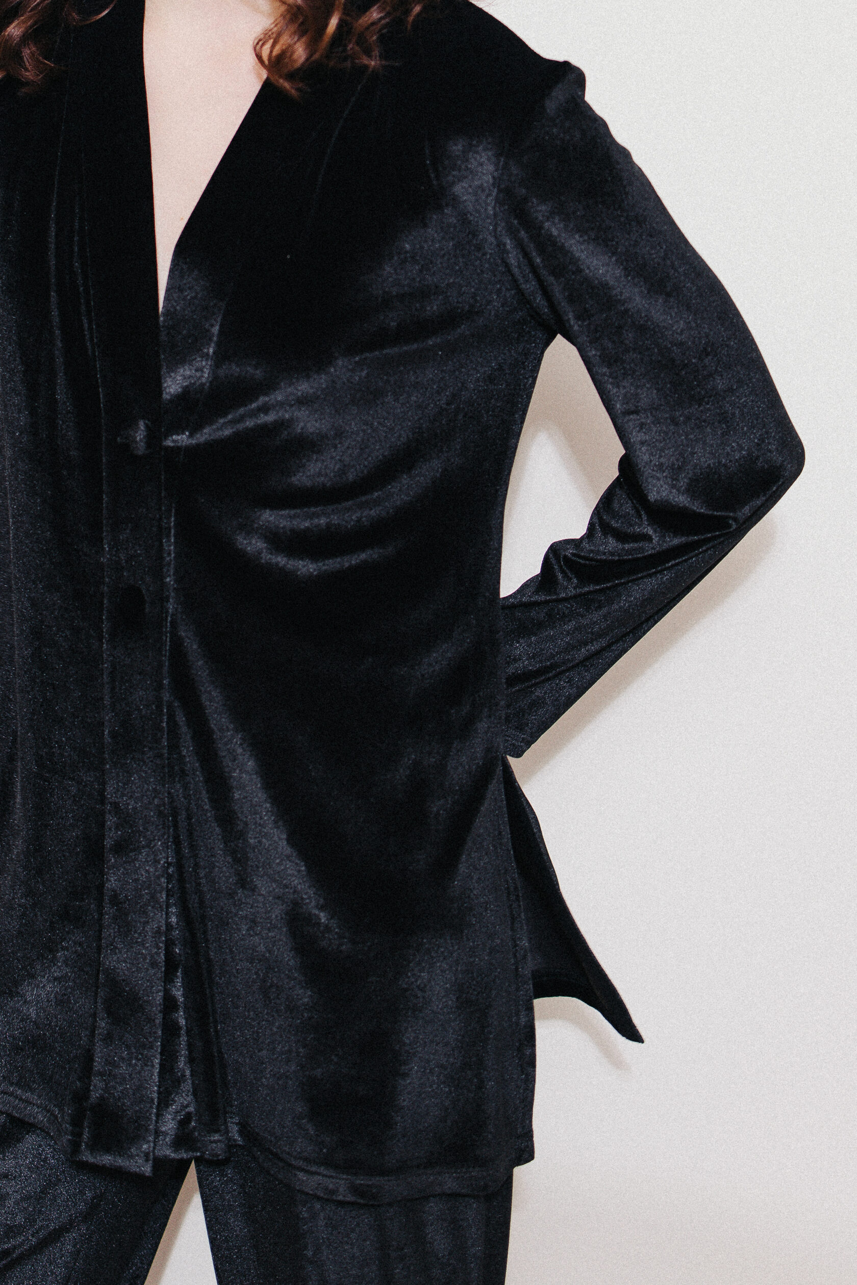 Костюм из черного бархата. Немного приталенный жакет на двух пуговицах имеет идеальную посадку в плечах и груди. Благодаря деликатным разрезам по бокам, он не только не сковывает движения, но и визуально удлиняет силуэт. Костюм дополняют брюки на мягкой резинке свободного кроя. Жакет и брюки можно носить как вместе, так и по отдельности. Идеален и универсален для дома. Вечеринка, детский домашний праздник или тихий вечер у камина - в нем вам всегда будет уютно и красиво.