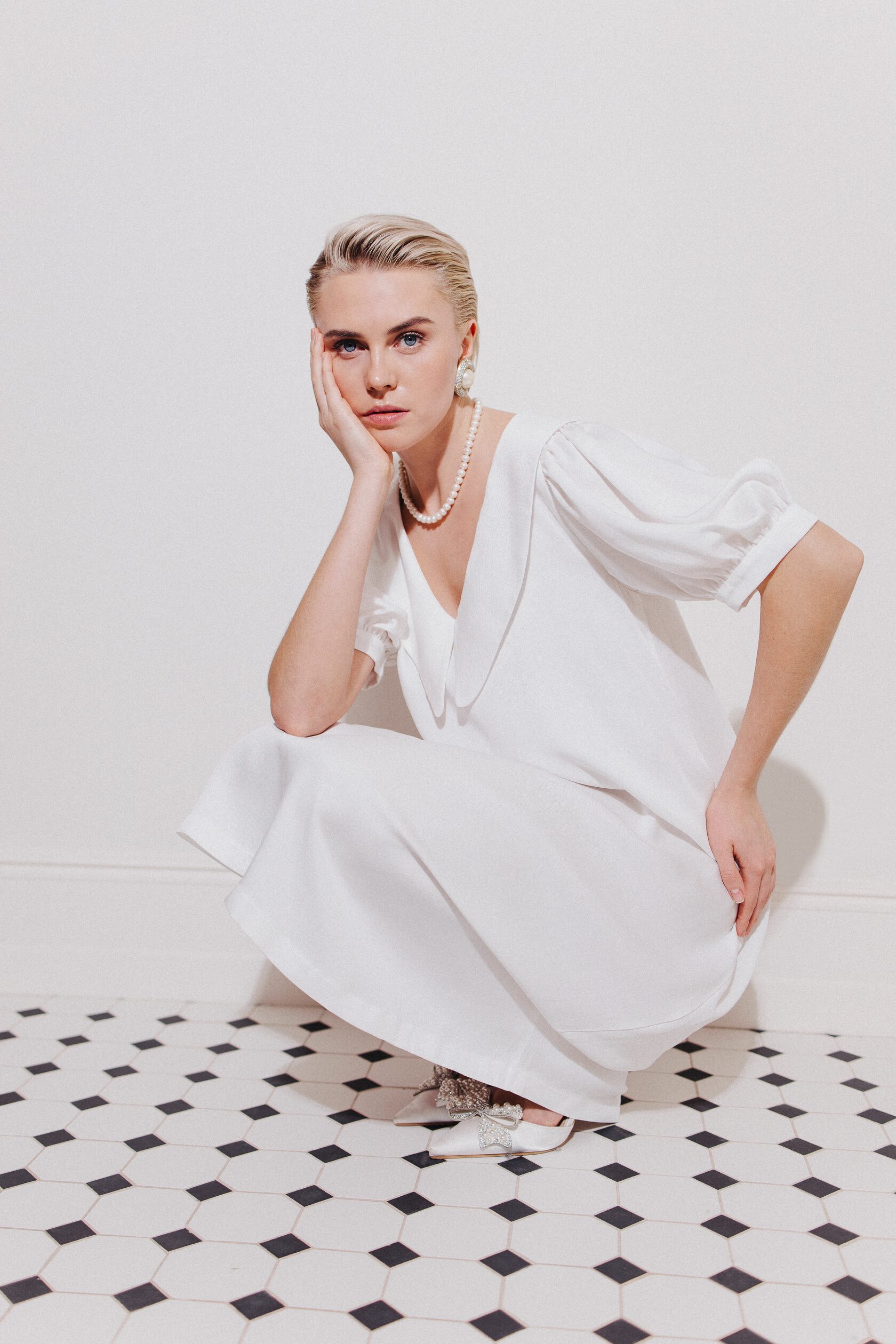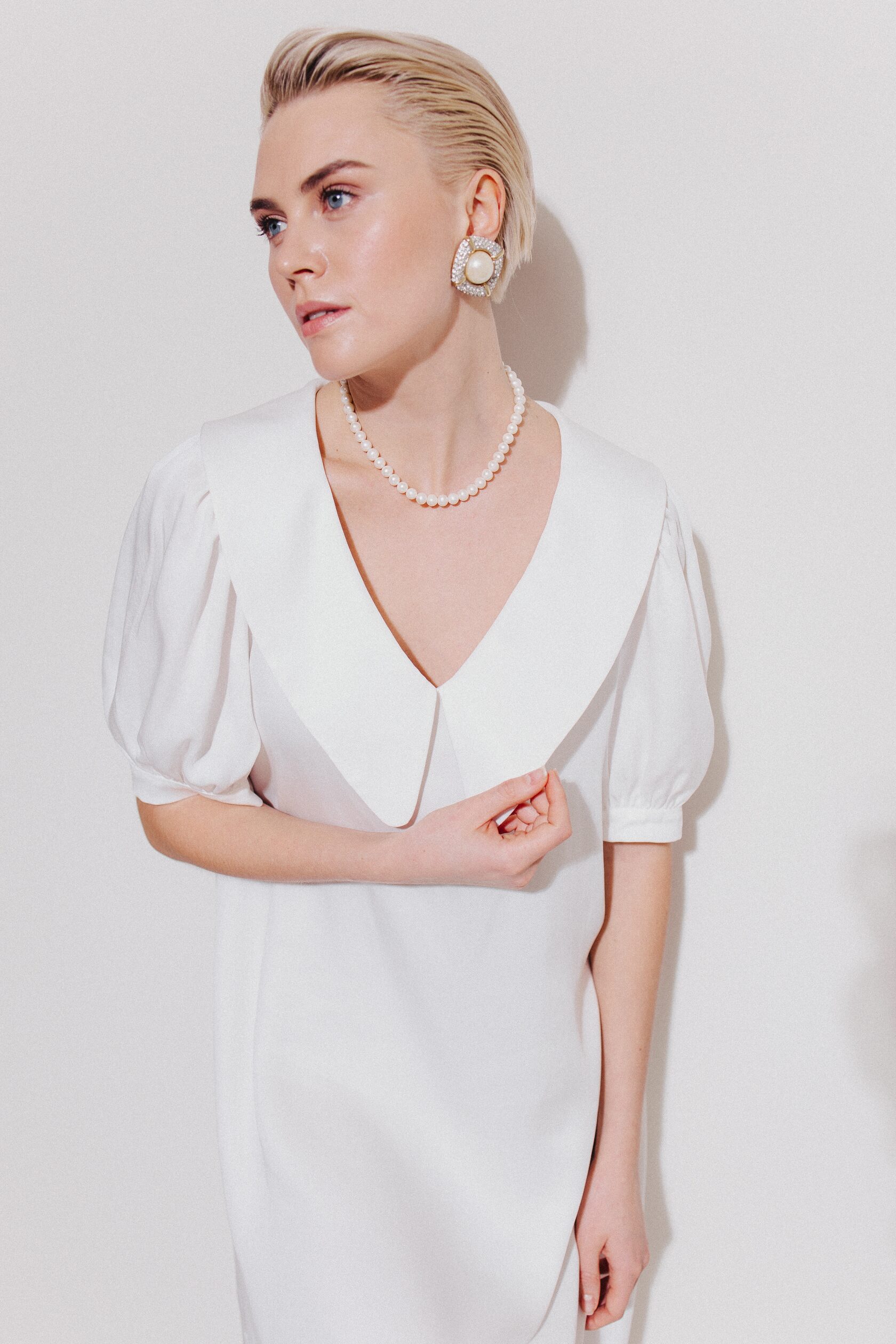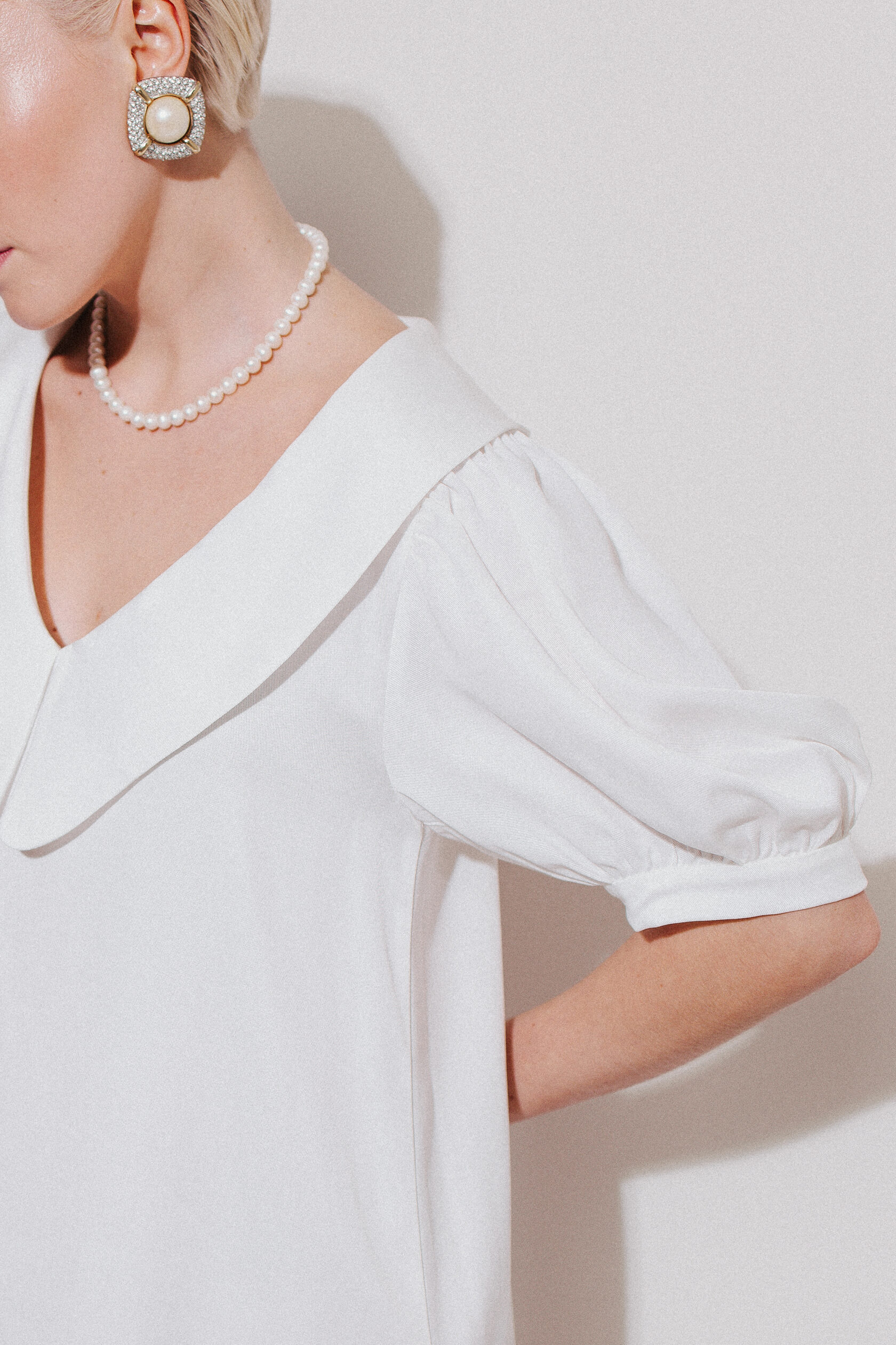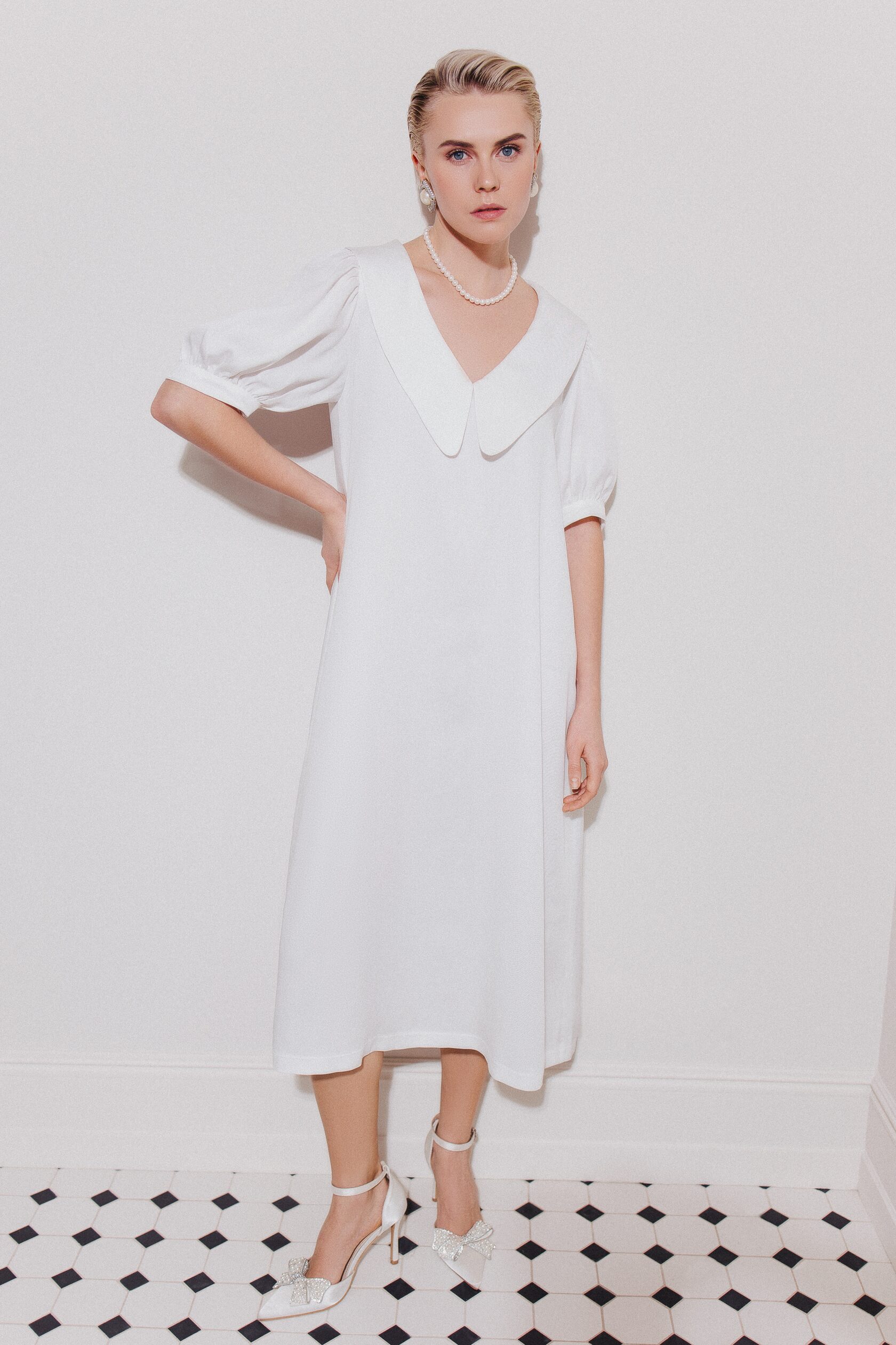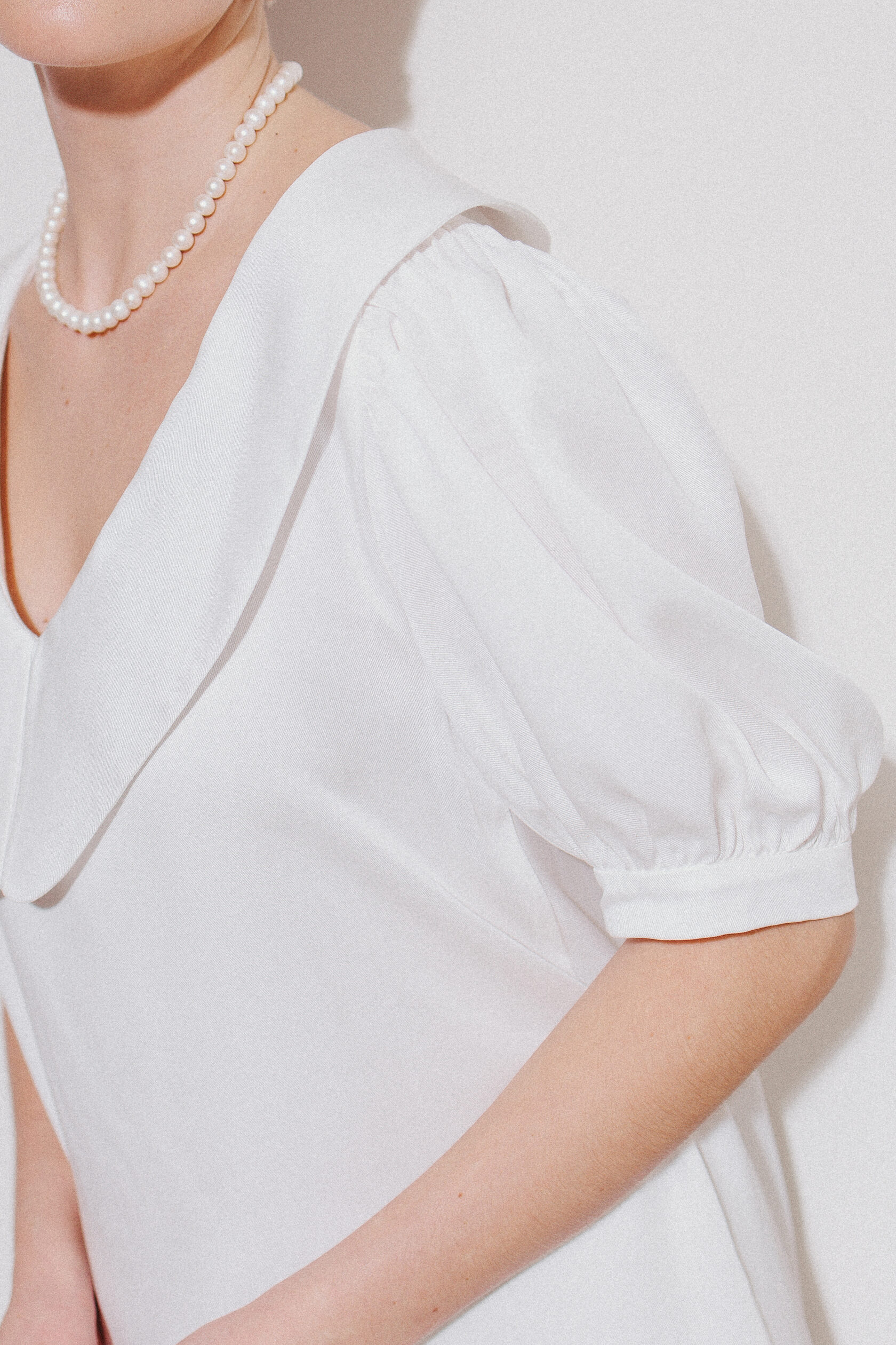 Платье миди из нежной струящейся ткани молочного цвета. Платье украшено рукавами фонариками, что делает силуэт рук утонченным. Воротник держит форму, подчеркивая линию шеи и плеч. Свободная посадка, удобная длина и струящаяся ткань позволят вам проводить время с комфортом, при всей элегантности этого домашнего образа. Идеально как для семейного ужина, домашних праздников, так и для тихого романтического вечера.